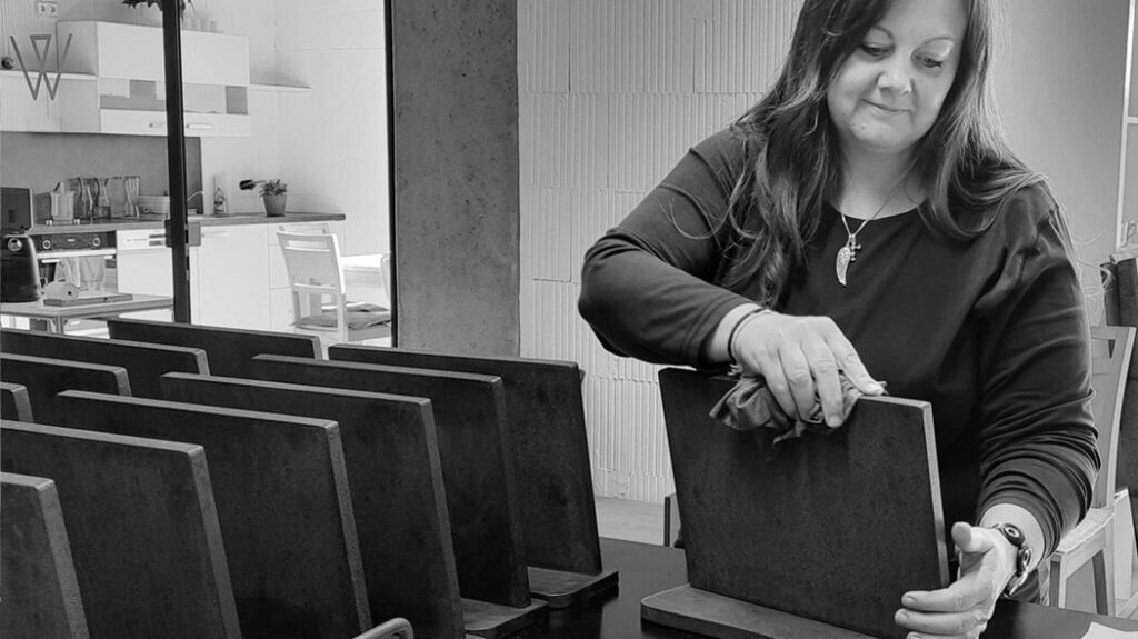 Ein anderes Material musste also her! Wunschleder-Chef Rainer ist schon lange ein Fan vom individuellen Rost-Look von Cortenstahl und schwer ist Stahl in jedem Fall. Also wurden erste Prototypen mit Cortenstahl ausprobiert, was deutlich besser funktionierte. Der Messerblock stand nun sicher an seinem Platz.