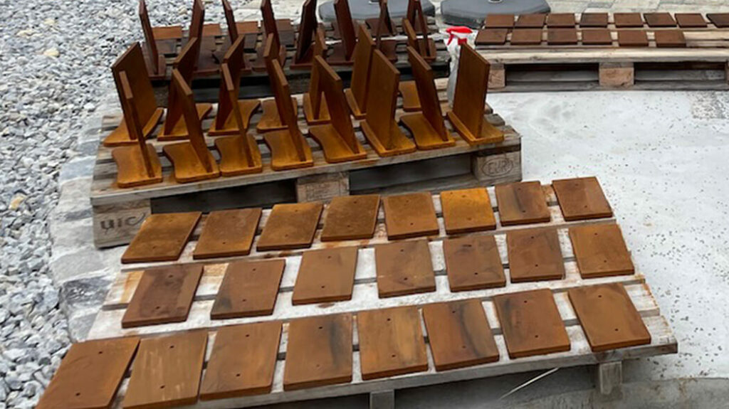 So entstand der Block Holz. Anfängliche Versuche, die Holzkonstruktion mit Sand zu befüllen, scheiterten leider auch am Gewicht bzw. an der Stabilität. So bekam auch der Block Holz einen Sockel aus Cortenstahl und steht seitdem ebenso stabil wie sein Kollege aus Metall.