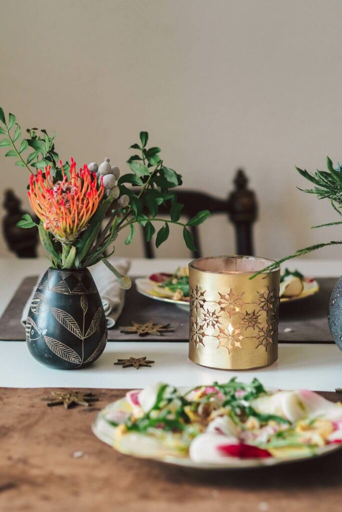 Auf unserem festlich gedeckten Tisch darf unsere Wunschleder Weihnachtsdeko natürlich nicht fehlen! Dieses Jahr sind die goldenen Windlichter und Sterne zum Einsatz gekommen. Passend dazu ein goldener Kerzenleuchter und zwei kleine Blumensträuße. Jeder Platz ist mit einem Pferdeleder-Tischset, Leinenserviette und ein bisschen Grünzeug dekoriert. Wir haben uns bewusst gegen Tannenzweige und Rote Kugeln – und für einen etwas moderneren und schlichten, aber festlichen Look entschieden.