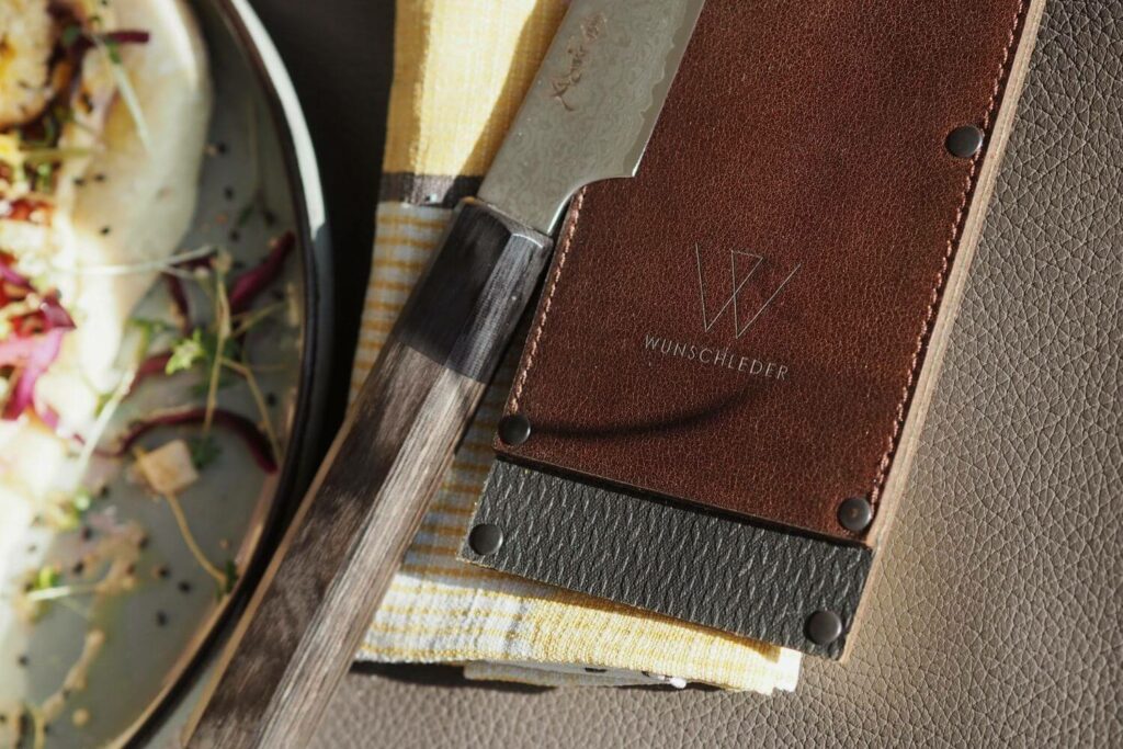 Aus dem Wunschleder Sortiment sind natürlich auch wieder die passenden Produkte zum Einsatz gekommen! Ich habe die Fladenbrote auf grauen Tischsets serviert. Fehlen darf auf keinen Fall ein scharfes Messer zum durchschneiden, ansonsten ist es nicht ganz so leicht, den belegten Fladen zum Mund zu führen… Das Messer liegt im Klingenschutz gemeinsam mit einer Serviette bereit. Mehr braucht es für dieses Essen auch nicht – simpel und einfach, aber schön!