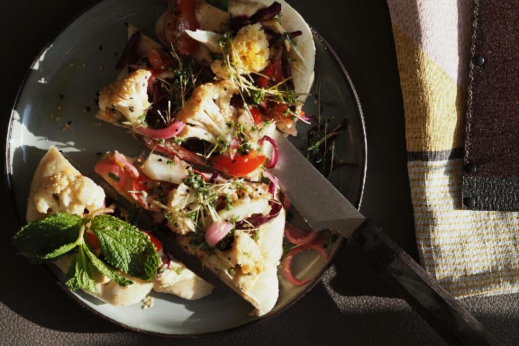 Dafür als erstes großzügig das Hummus auf dem Fladen verteilen. Dann folgt das Rotkraut, wie ich das hergestellt habe, gibt es im Beitrag zum eingelegten Gemüse zu lesen. Dann mit Blumenkohl, Gurken und Tomaten belegen. Koriander und Minze hacken und gemeinsam mit der Kresse über alles streuen. Als Farbtupfer und um alles abzurunden ein paar Pickled Red Onions – auch dieses Rezept findet ihr bereits hier auf dem Blog – belegen. Zuletzt mit frischem Zitronensaft und Olivenöl beträufeln und mit Schwarzkümmel garnieren.