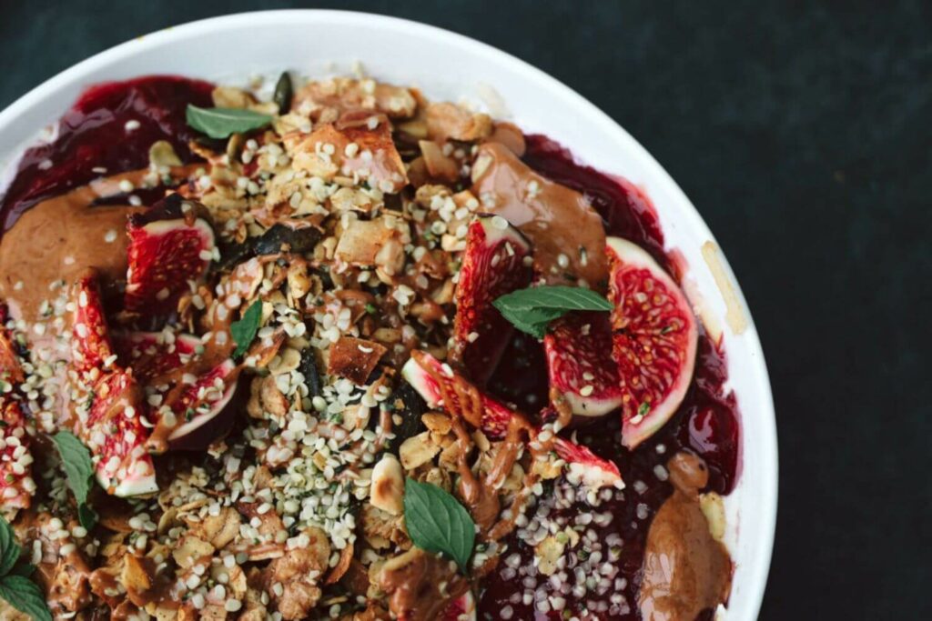 Als erstes das Zwetschgenkompott großzügig auf den Haferflocken verteilen, dann das Granola dazugeben und mit den Feigen belegen. Das Mandelmus in Klecksen über allem verteilen. Wenn ihr habt, zum Abschluss noch ein paar Hanfsamen darüber geben und mit Minze garnieren.