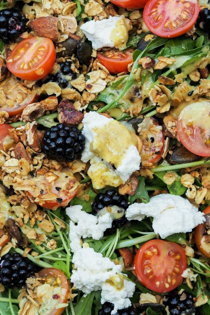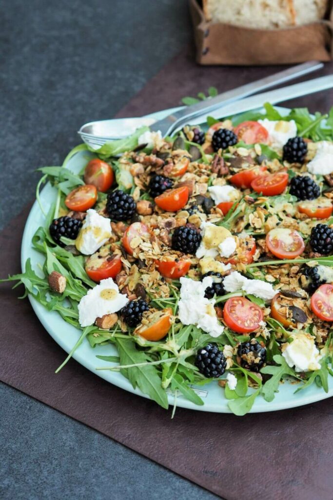 Im Garten sind noch Brombeeren reif, die Tomaten haben gerade das beste Aroma. Auch der Rucola wächst noch gut und kommt natürlich zum Einsatz. Mit dem passenden Dressing, dem salzigem Granola und ein bisschen Ricotta entsteht daraus im Handumdrehen ein richtig schöner Herbstsalat, oder viel mehr Spätsommersalat.