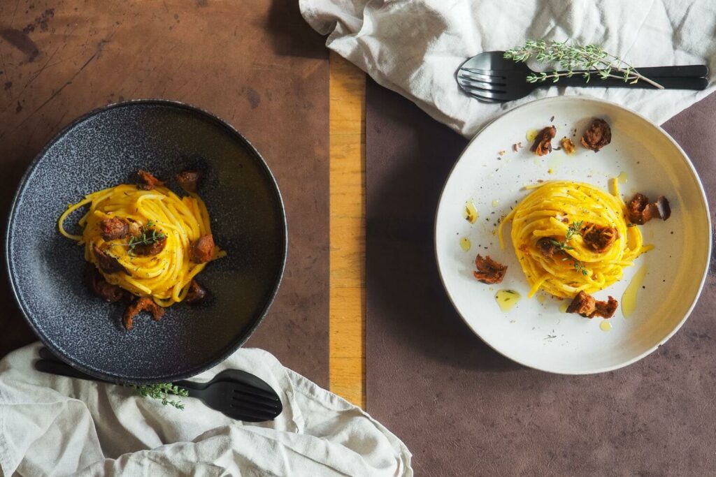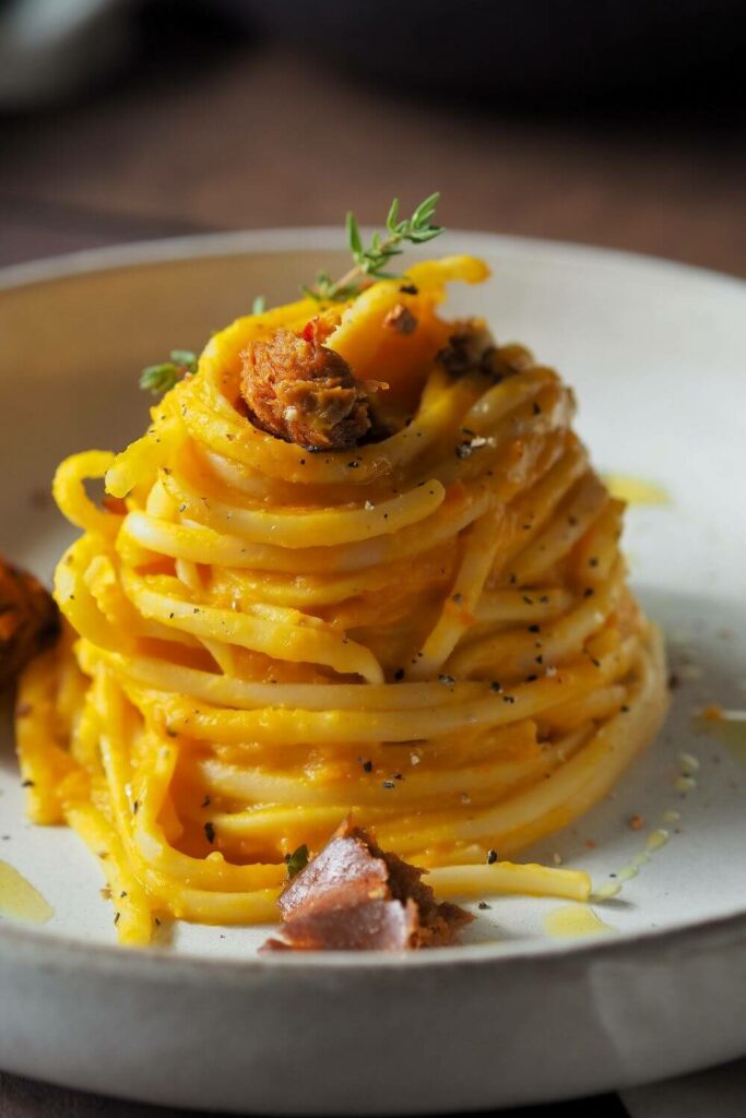Denn heute gibt es Nudeln mit Kürbissauce und gebratener Chorizo. Schön Orange also. Dafür wird der Kürbis einfach nur gekocht, gewürzt und zu einem Püree gemixt, das jede Nudel cremig umhüllt. Lässt sich genauso gut übrigens mit Roter Bete und Blumenkohl zubereiten und schmeckt auch beides unglaublich lecker.