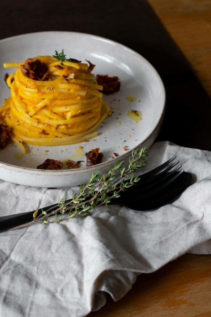 Die al dente gekochten Nudeln abgießen und zur Kürbissauce geben. Beides zusammen gut verrühren und bei kleiner Flamme auf dem Herd stehen lassen, bis die Linguine die richtige Bissfestigkeit haben. Mit Salz und Pfeffer abschmecken.