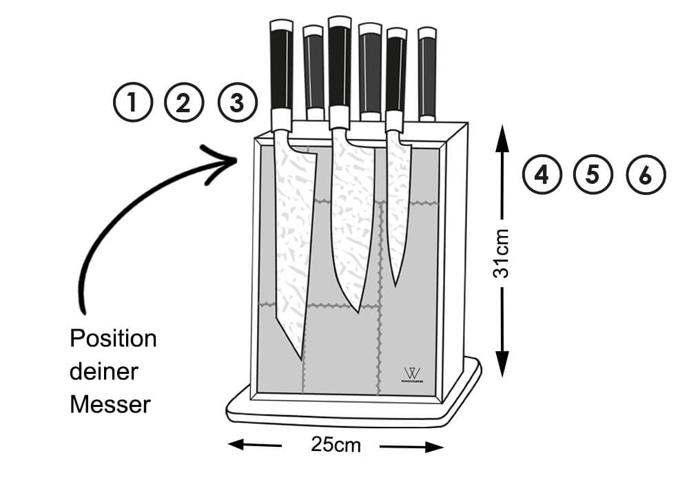Dieser Messerblock ist für maximal sechs Messer mit einer Klingenlänge von bis zu 27cm konzipiert, drei Messer auf jeder mit Leder gearbeiteten Seite. Bitte achte beim Anlegen der Messer darauf, dass du die Klinge direkt über den Magneten positionierst. Das Leder bietet die perfekte Präsentationsfläche für deine Liebilingsmesser!