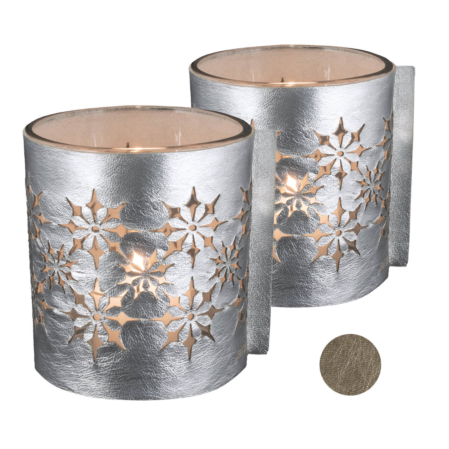 Gerade zu festlichen Anlässen lieben wir eine gemütliche entspannende Atmosphäre mit besonderem Flair! Zu dieser Stimmung tragen diese Metallic-Windlichter nicht nur mit dem glänzenden Leder, sondern auch mit ihrem hübschen Lichtspiel bei!