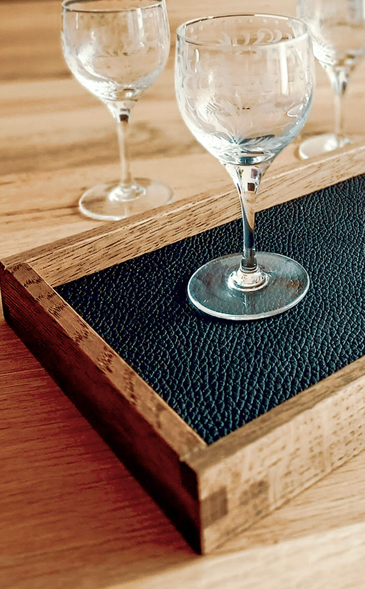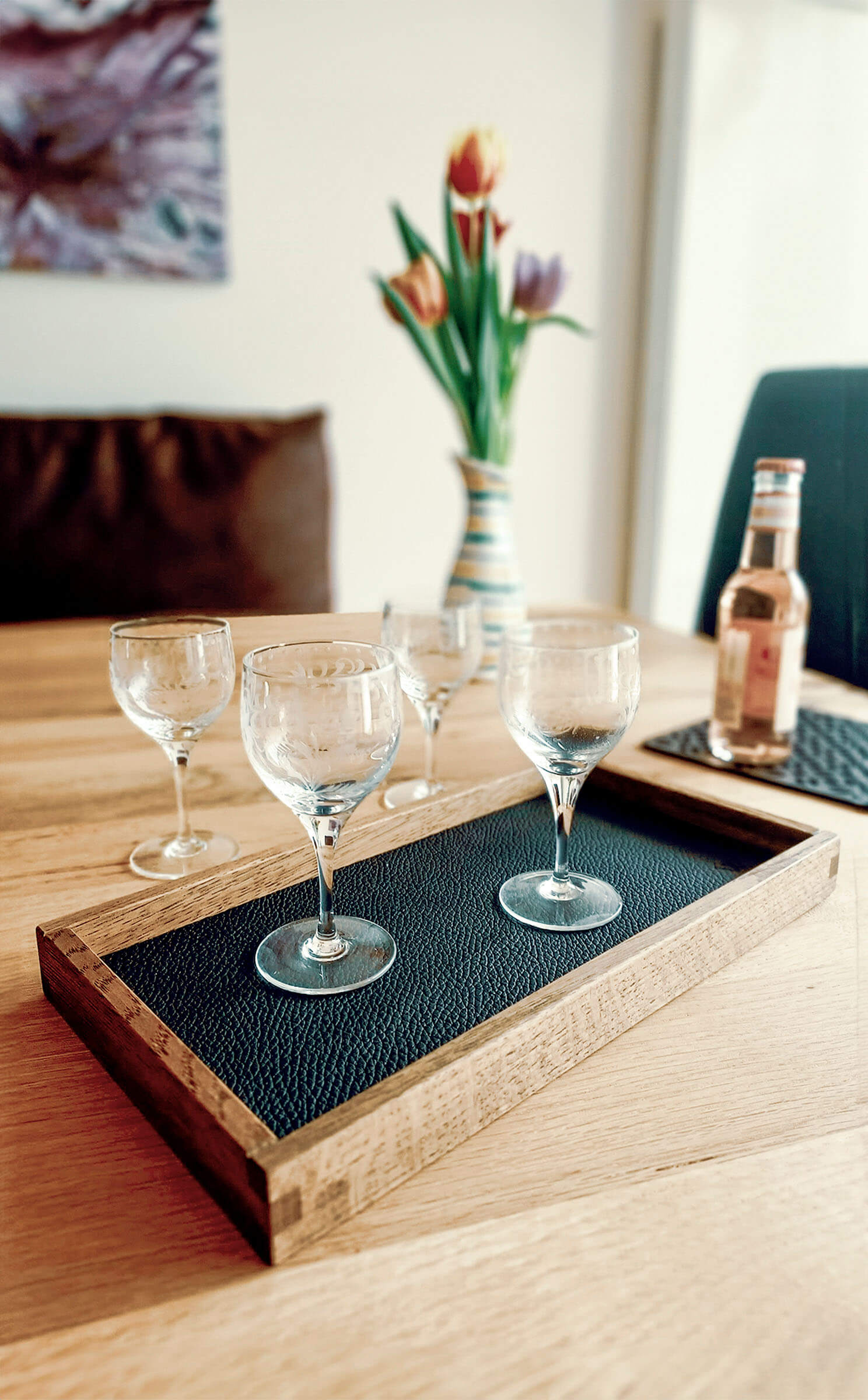Du möchtest eine schöne Tasse Kaffee oder ein edles Glas Wein stilvoll präsentieren? Oder einfach ein dekoratives Centerpiece für deinen Tisch gestalten? Dann ist dieses edle Holztablett mit Lederinlay perfekt für dich!