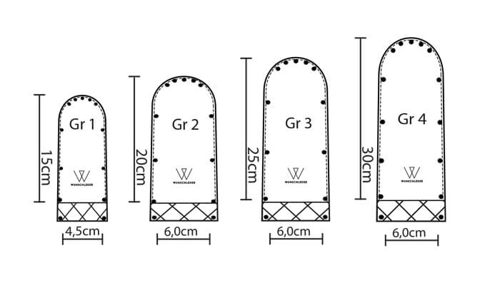• Das Innenmaß beträgt: Gr. 1 = 4,5 cm, Gr. 2 – Gr. 4 = 6,0 cm
