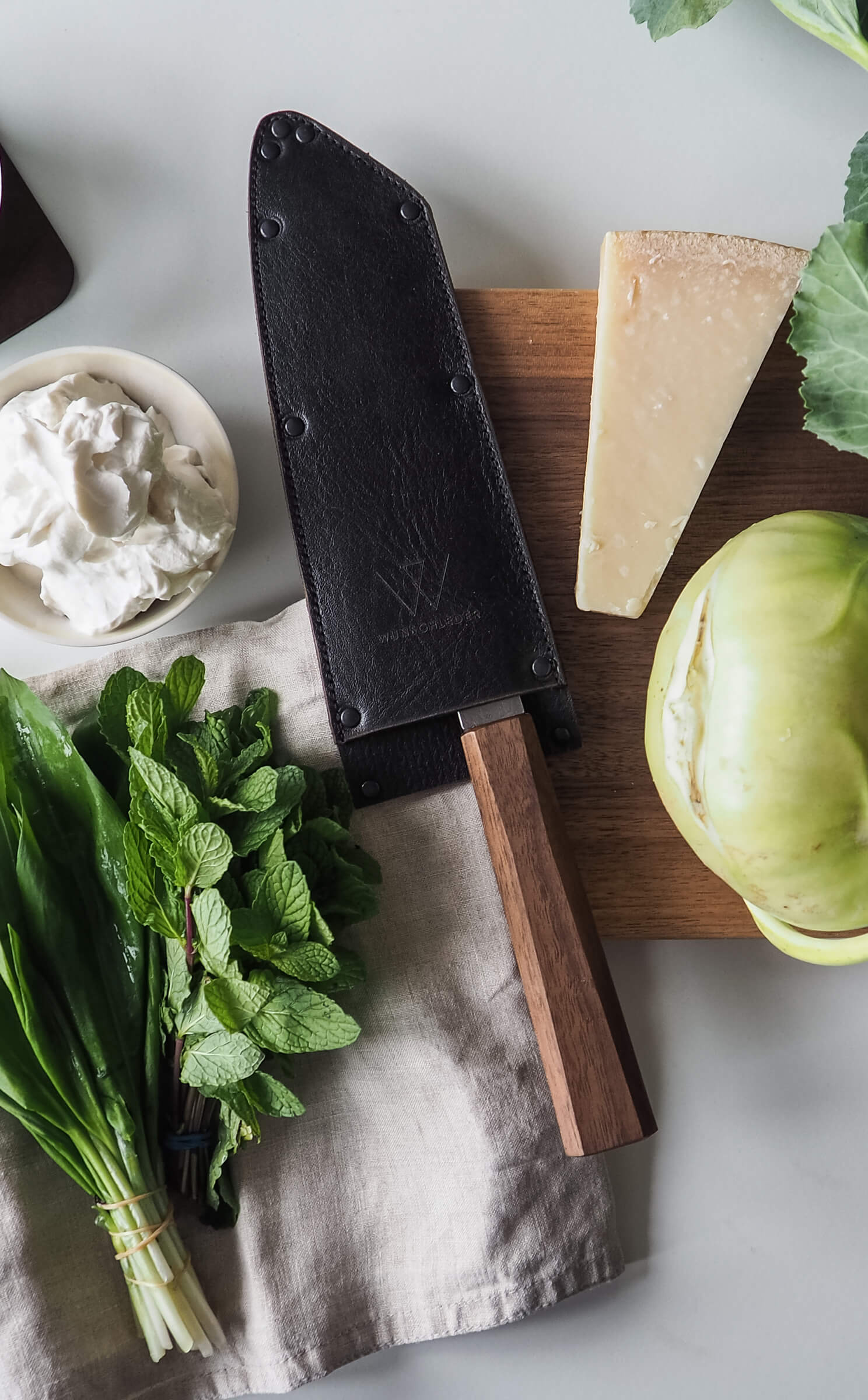 Wir setzen ein hochwertiges robustes Rindleder ein, das die Qualität deines guten Messers optisch noch unterstreicht. Es bietet mit einer Stärke von 2 mm einen stabilen Schutz für die Klinge. Bei Verschmutzung kann das Material ganz einfach feucht abgewischt werden. Die Nähte des Köchers werden zusätzlich mit Metallnieten verstärkt, sodass die scharfe Klingenspitze keine Naht verletzen kann. Gefertigt wird der Messerschutz in sorgfältiger Handarbeit mit viel Liebe zu Detail.