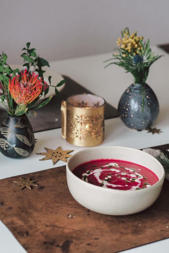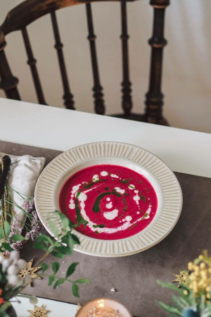 Nach dem leckeren Bunte Bete Carpaccio gibt es als nächsten Gang Suppe. Damit das Menü einen Zusammenhang hat und sich die Speisen ergänzen, bleiben wir noch beim Thema Bete und kochen eine Rote Bete Suppe. Allein schon wegen der tollen Farbe ist sie ein echter Hingucker. Die Suppe wärmt alle von innen schön auf und schmeckt dabei noch richtig lecker.