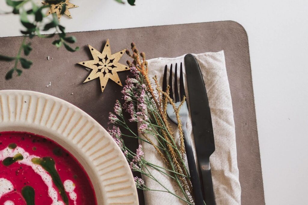 Als weihnachtliche Tischdekoration kommen bei uns Windlichter und Ledersterne zum Einsatz. Die Sterne haben eine goldene und silberne Seite, können also passend zum Rest der Deko gedreht werden. Zum Kronleuchter, goldenen Windlichtern und Kerzenschein haben wir uns für die goldene Seite entschieden. Dazu noch ein paar frische Blumen und Blätter, Kerzenlicht, Leinenservietten und Ledertischsets und fertig ist der elegant gedeckte Tisch!