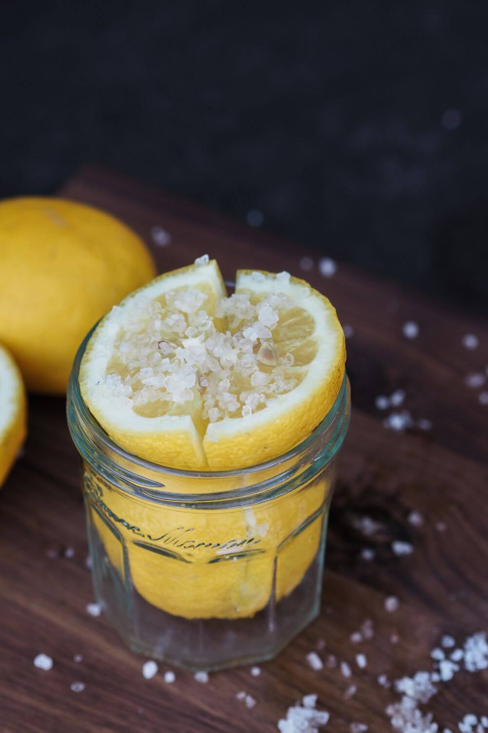 Die Zitronen gut abwaschen und von oben so vierteln, dass sie sich aufdrücken lassen, aber noch zusammenhalten. Die Schnittkanten großzügig mit Meersalz einstreuen und eng in das sterilisierte Einmachglas schichten. Zum Abschluss nochmal Salz in das Glas geben und mit kochendem Wasser übergießen und verschließen.