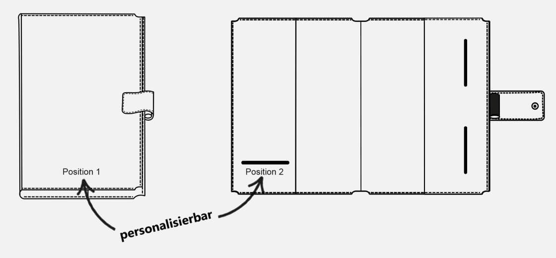Wie du sicher weißt, werden alle Wunschleder-Produkte in unserer eigenen Manufaktur in Deutschland hergestellt. Da jedes Stück einzeln und von Hand gefertigt wird, können wir dir einen ganz besonderen Service anbieten: eine individuelle Gravur! So kannst du deine Kalenderhülle mit deinen Initialen, deinem Namen oder einem motivierenden Spruch selbst gestalten und erhältst ein echtes Unikat! Es sind sogar zwei verschiedene Gravurpostitionen möglich – mittig auf der Vorderseite (Position 1) oder am linken Rand auf der Innenseite (Position 2).