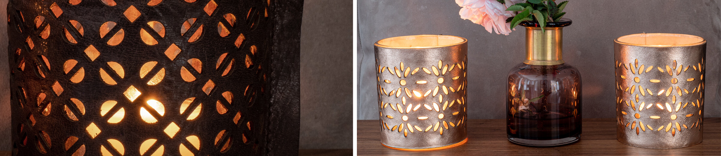 Ein Windlicht aus Leder schafft eine gemütliche Atmosphäre