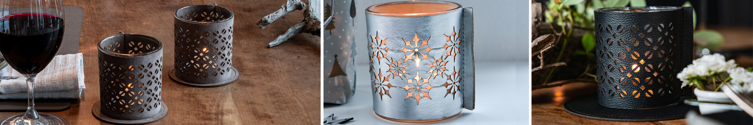 In Wunschleder Home Shop findest du viele verschiedene Windlichter im klassischen Wunschleder-Design. Jedes Windlicht besteht aus einem runden Glas mit senkrechter Seitenwand und einer passenden Ledermanschette. Das Leder ist mit einem Lochmuster verziert, durch welches ein wunderschönes Lichtspiel entsteht, sobald ein Teelicht im Glas brennt. Wie alle unsere Produkte werden die Windlichter in unserer eigenen Manufaktur in Deutschland hergestellt – faire Arbeitsbedingungen und beste Qualität sind für uns selbstverständlich.