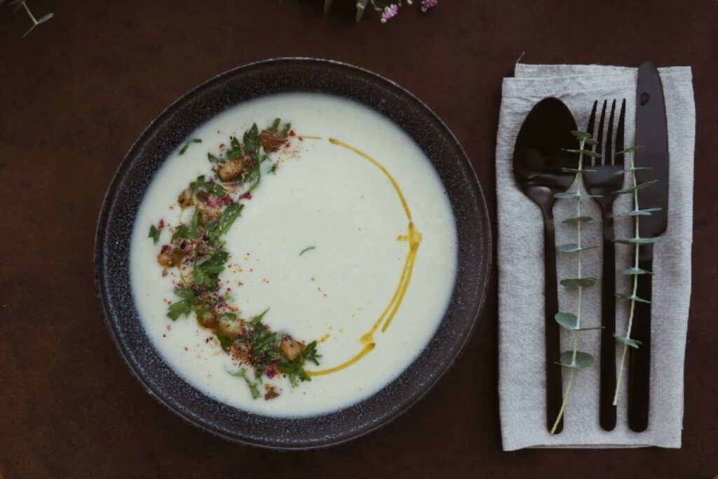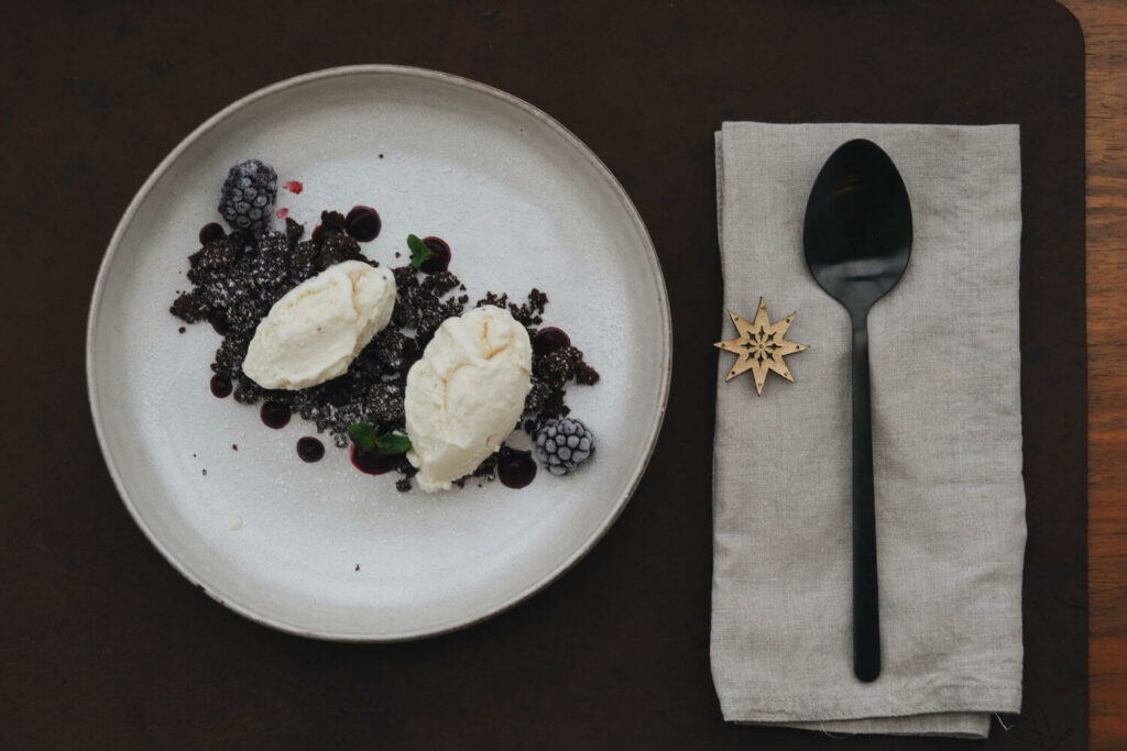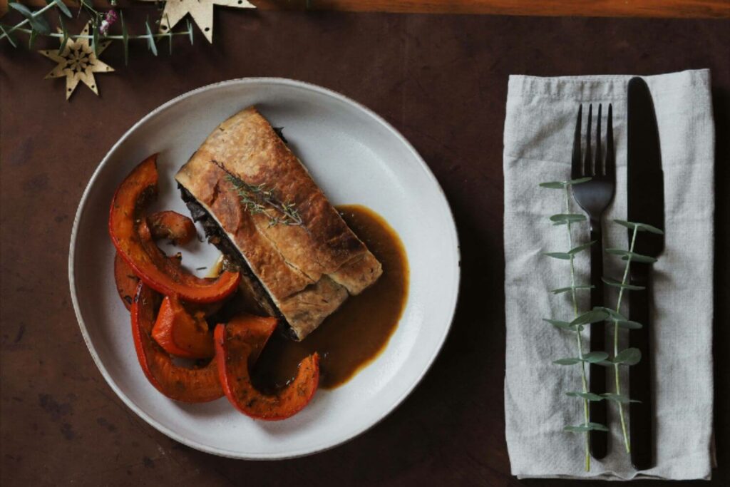 Es gibt eine Blumenkohlsuppe mit Kokosmilch und gerösteten Maronen, gefolgt von einem weihnachtlichen Salat mit Fenchel und Orange. Als Hauptspeise servieren wir Pilz Wellington mit geröstetem Kürbis und Sauce und als Nachspeise gibt es Vanilleeis mit Beeren und Schokolade.